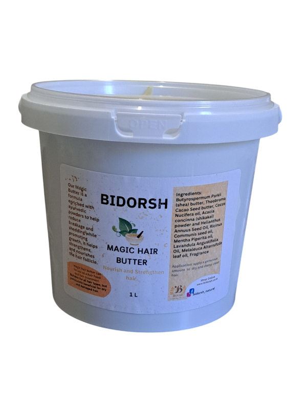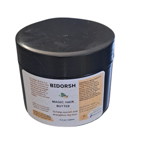 The Bidorsh Magic Butter is a formula crafted with natural ingredients, Enriched with Ayurvedic powders to helps reduce breakages and shedding of hair while promoting growth. It helps strengthen, and nourish the hair follicles.