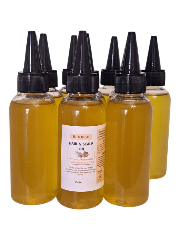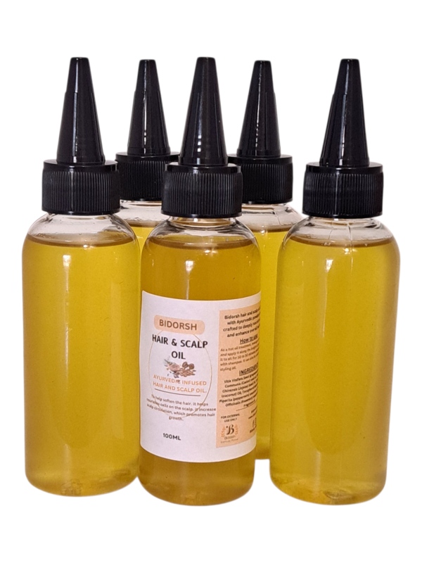 Bidorsh hair and scalp oil is a holistic blend formulated to nourish, strengthen, and rejuvenate hair and scalp health. It combines the rich properties of various carrier oils and essential oils with traditional Ayurvedic powders known for their beneficial effects on hair.